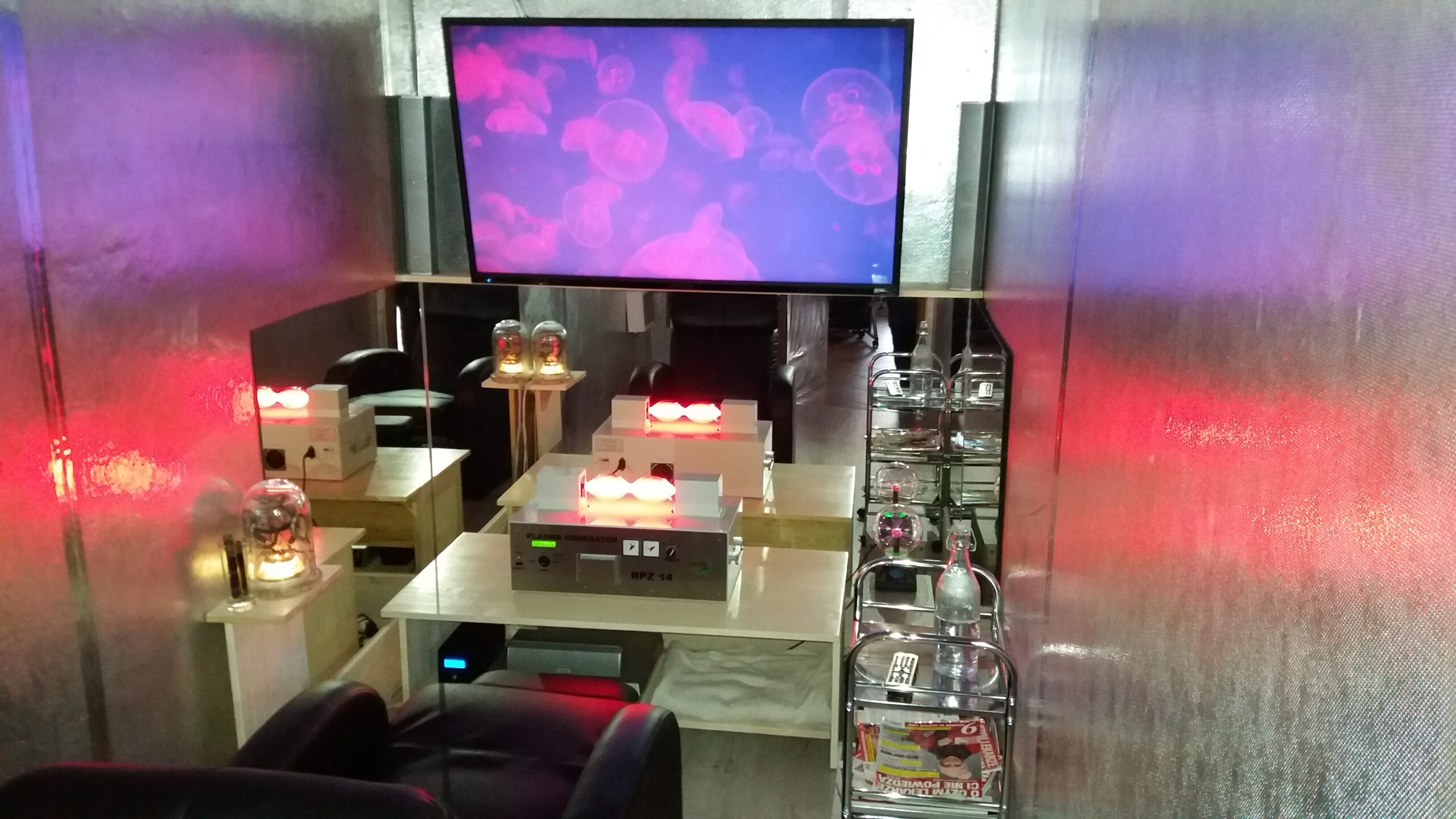 Dla wzmocnienia działania generatorów plazmy- stworzyliśmy specjalnie przygotowane, ekranowane pomieszczenie (komorę plazmową). Jest to nowatorska technologia zwiększająca skuteczność, zakres i możliwości systemu energo-terapeutycznego (Plazmoterapii).